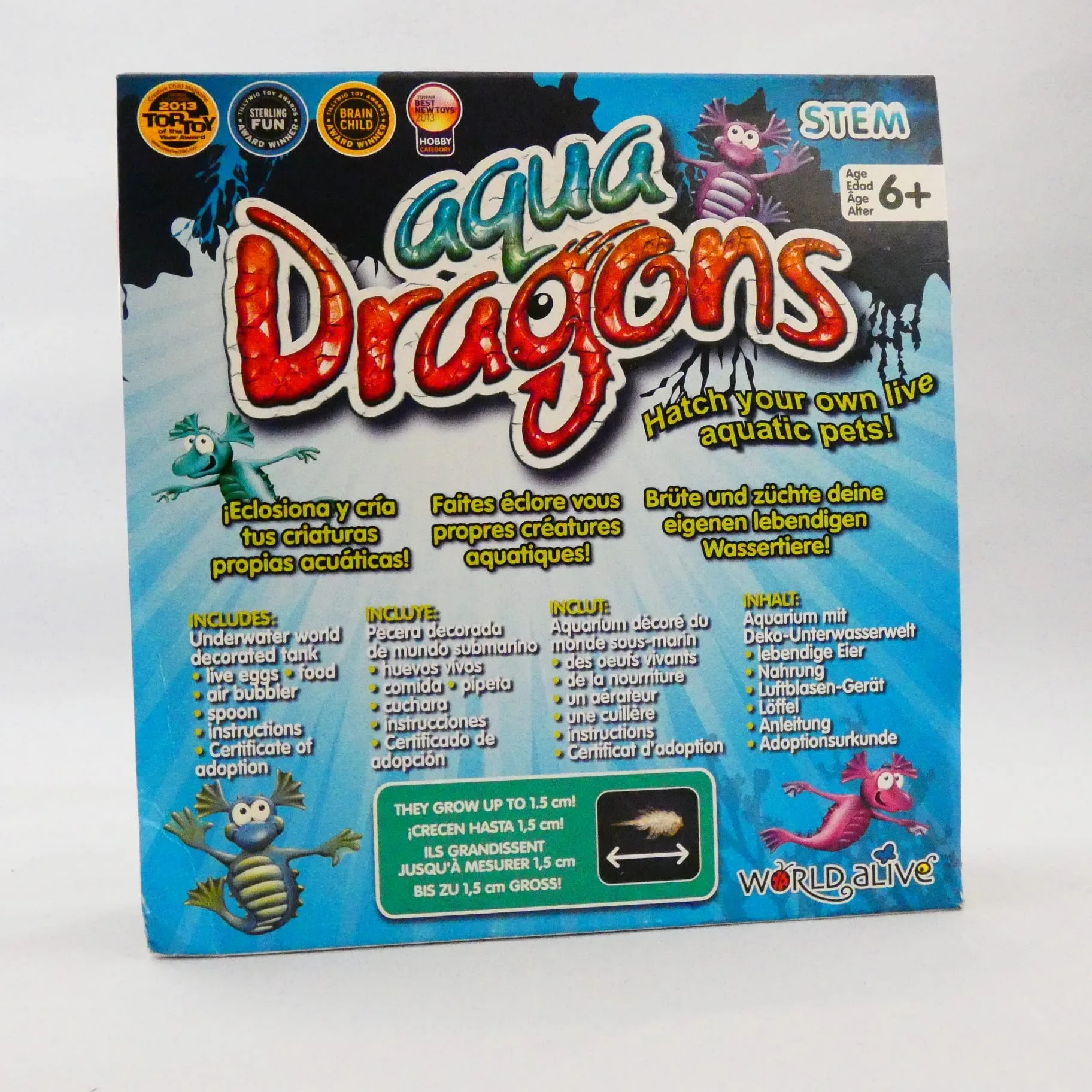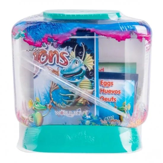De kit bevat alles wat je nodig hebt om aan de slag te gaan, behalve water dat je zelf toevoegt. Geniet van de volledig gekleurde onderwaterwereld met een prachtig gedecoreerde tank en een handige deksel. In de set vind je Aqua Dragon eieren, speciaal voeding, een voederlepel en een pipet voor eenvoudig onderhoud. Bovendien ontvang je duidelijke instructies in het Engels, Spaans en Frans.